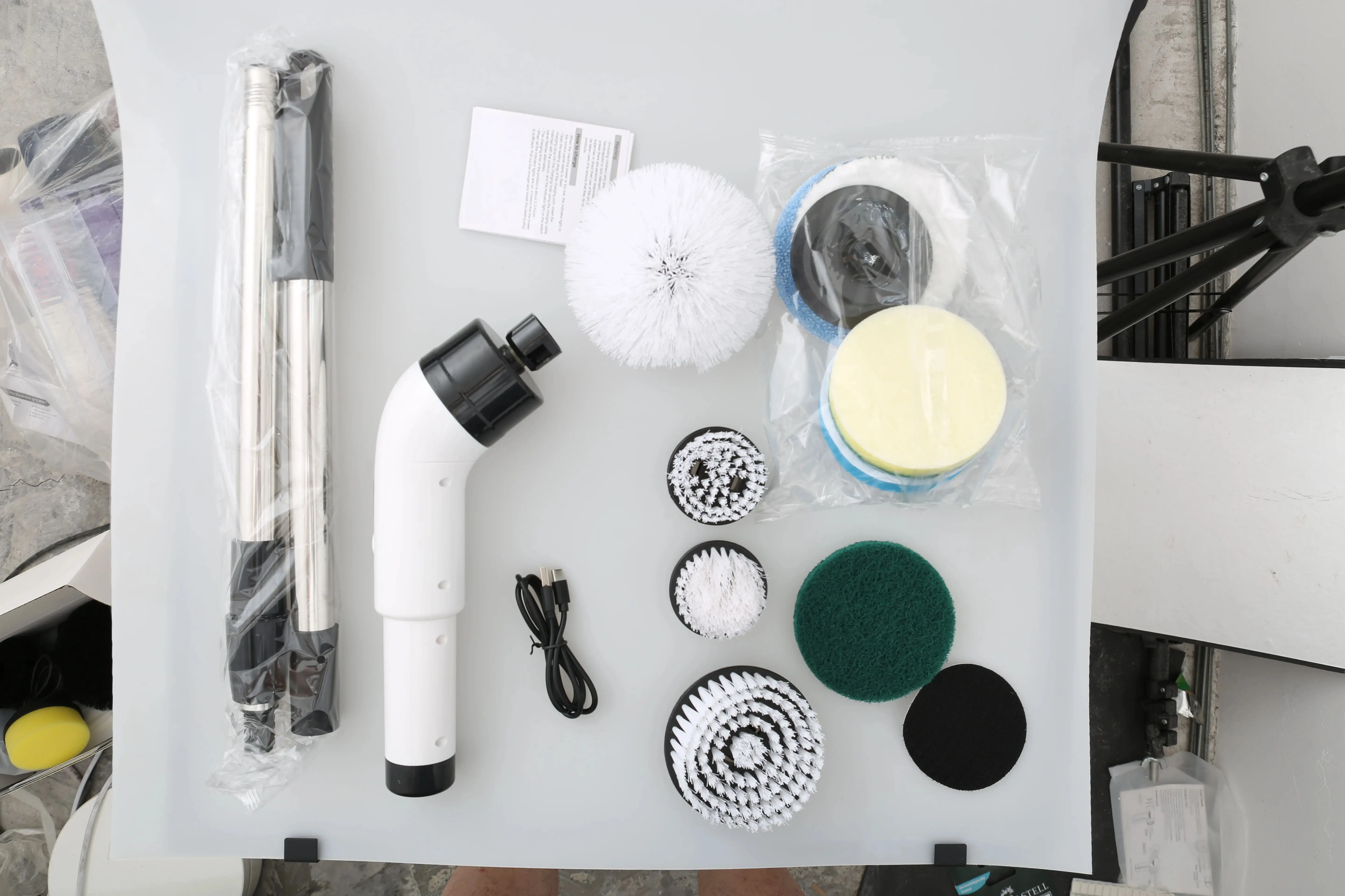 Electric spin scrubber cleaning kit with multiple brush heads and extension handle